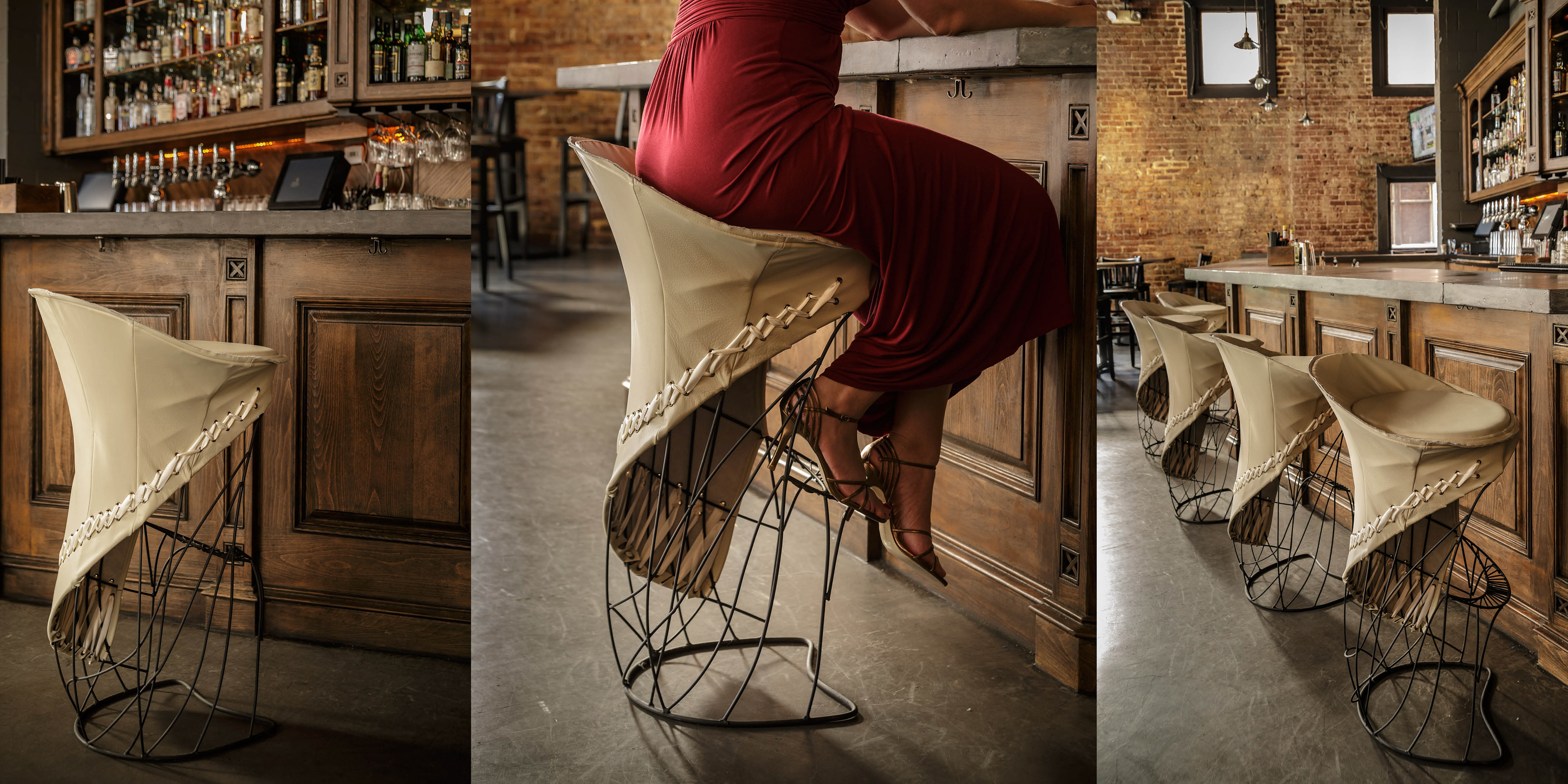 Pique is designed for restaurants and bars with an industrial, raw-material aesthetic. The design is inspired by the conceal/reveal nature of Victorian fashion, and the ceremonial tying and tailoring of the corset. The final design has an asymmetrical quality, with each angle appearing differently to the viewer. As you approach it, you are slowly exposed to the raw, inner structure being conceal by the refined outer leather. People often indulge themselves at a bar, so their environment should be as equally experiential and luxurious.